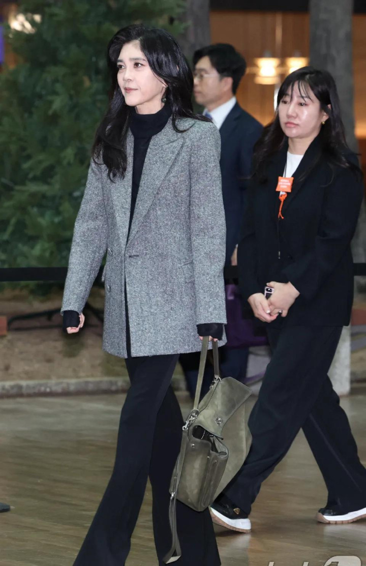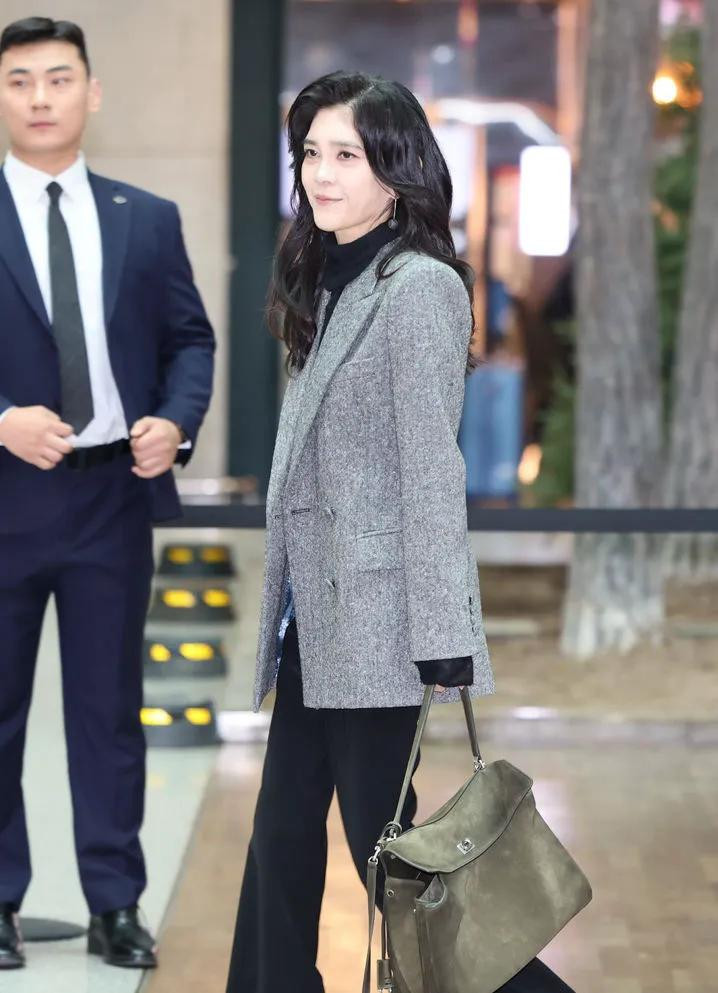 李富真一出场太过惊艳,她穿了一件浅灰色西装外套,搭配黑色毛衣,穿了一条黑色裤子,整体打扮商务范儿而不缺优雅时尚,是李富真一贯的风格。